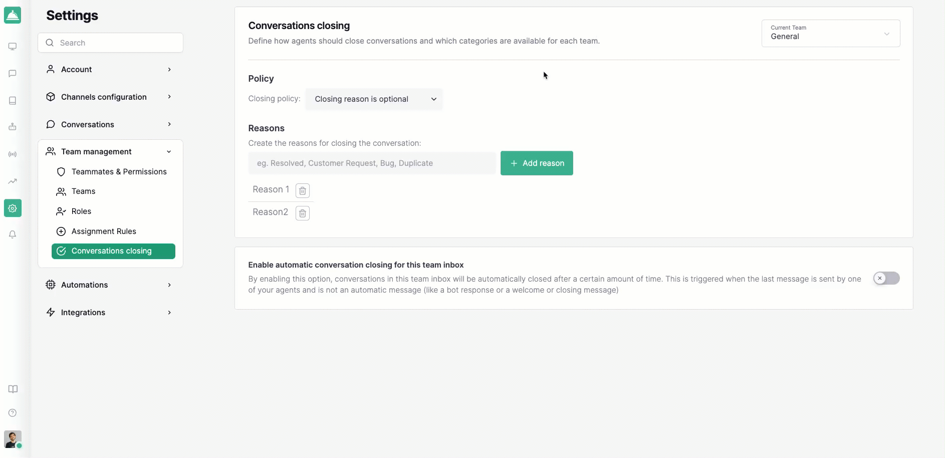 Hemos introducido Motivos de Cierre, una forma de categorizar las conversaciones cuando se cierran. Esto facilita comprender la intención del cliente, medir resultados e identificar problemas recurrentes.