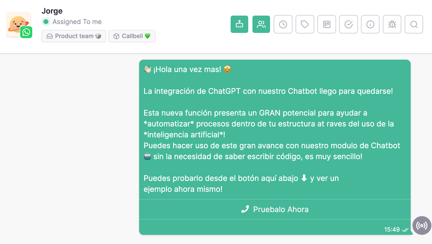 Fini la confusion sur l’origine d’un message. Les messages envoyés par diffusion s’affichent maintenant directement dans l’historique du chat, afin que les agents puissent voir immédiatement quelle campagne a initié la conversation.