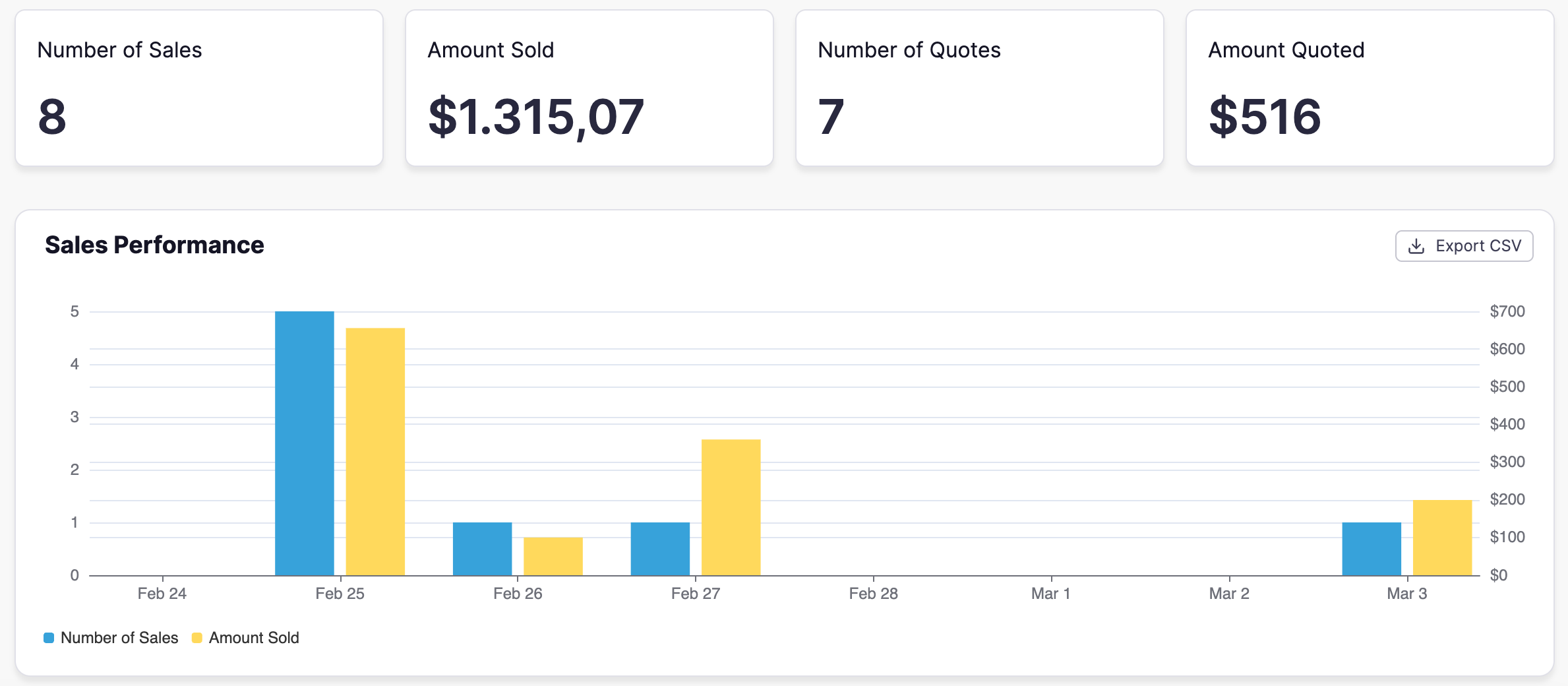Vous pouvez également filtrer les résultats par date, canal, agent ou équipe, et exporter l’historique complet des ventes et des devis pour une analyse plus approfondie.